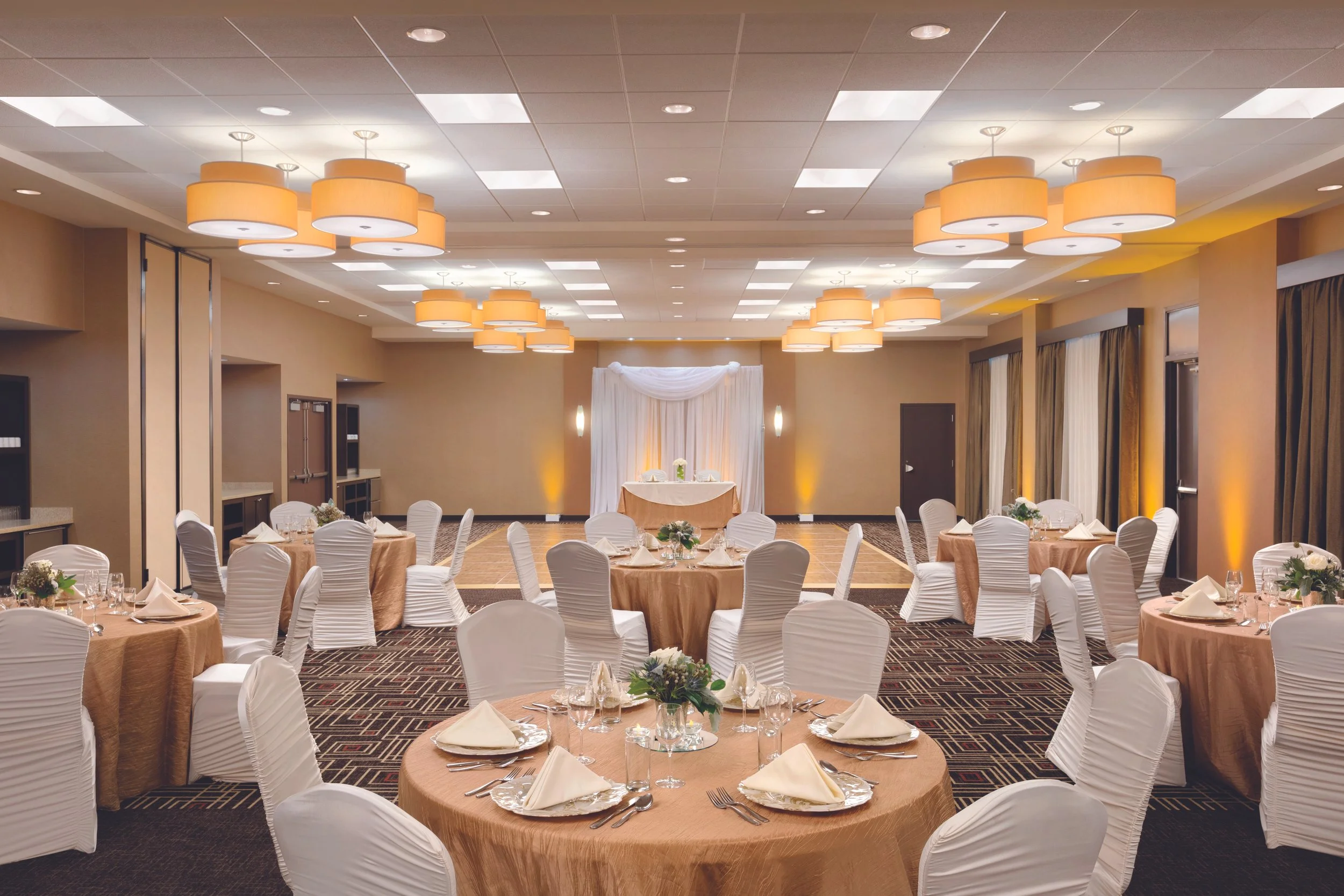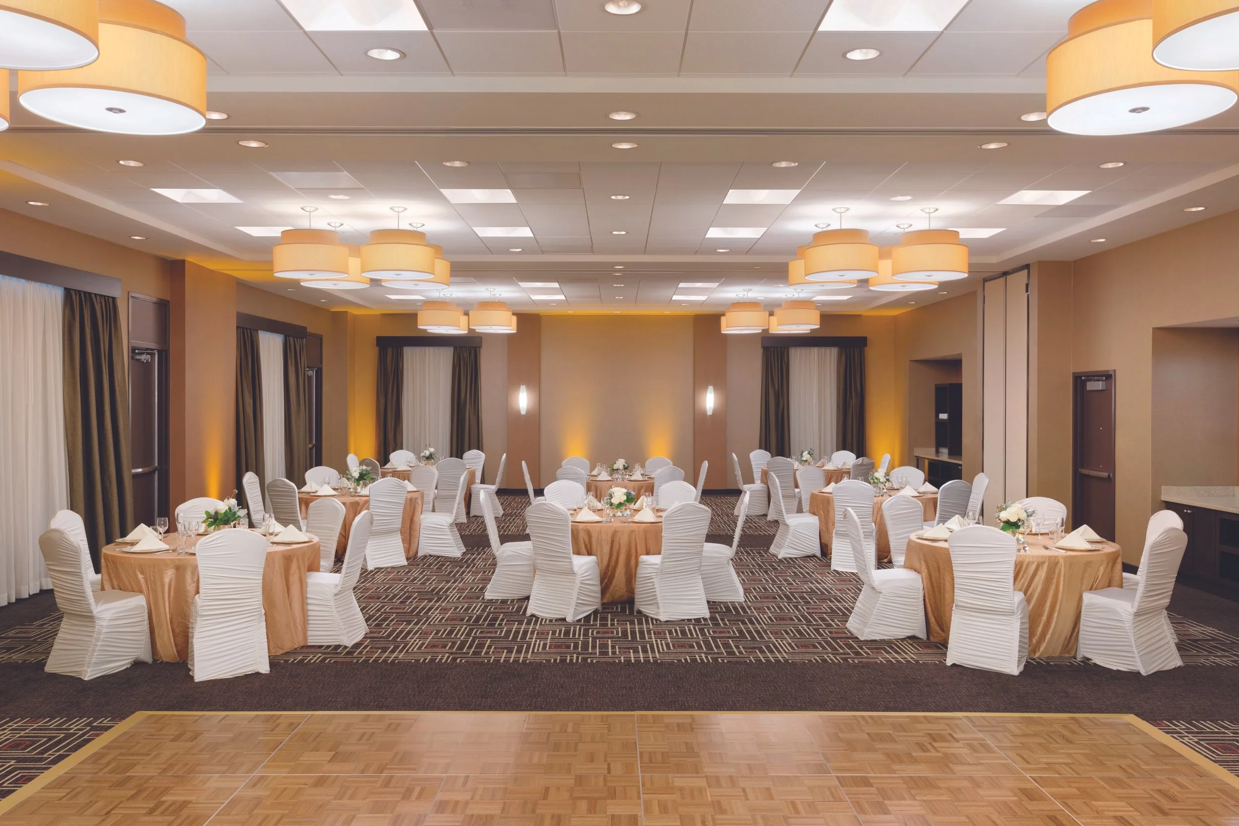 Room blocks at Hyatt Place for wedding guests, with complimentary breakfast and pool access. Bridal suite access for day-of preparation. On-site event coordinator from initial walkthrough to last dance. Customizable floor plans, lighting, and décor coordination. Full-service catering with tastings available. Ample parking and EV charging stations.